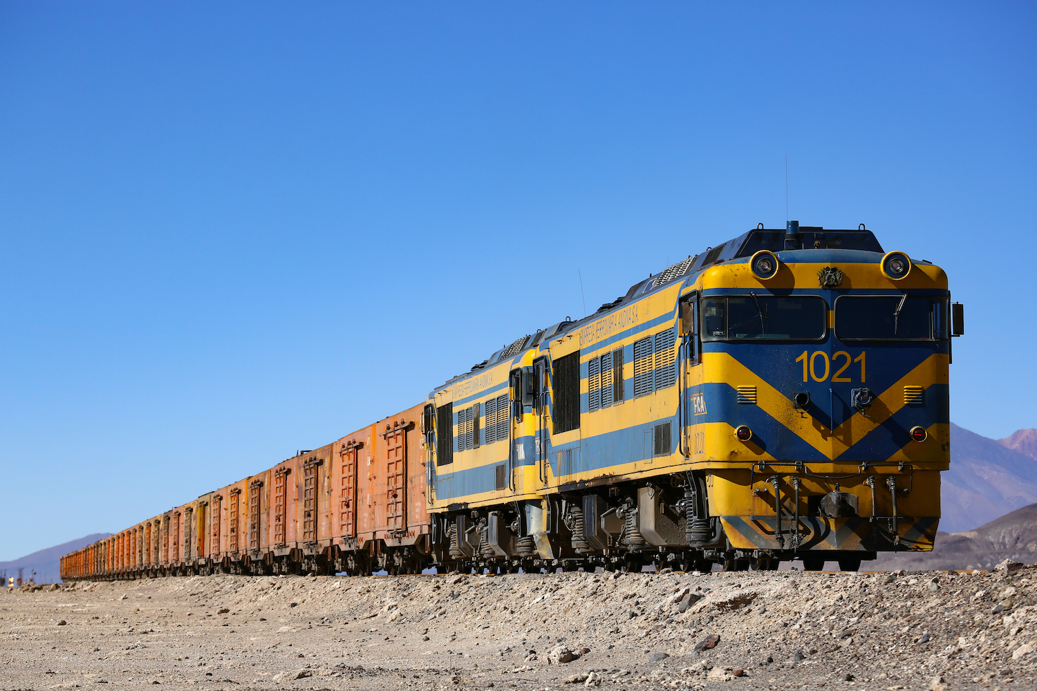 チリ側で列車を撮影したら、今度はボリビアから国境を越えてやってくる列車を狙うために移動する。国境警察に事情を話すと、なんと「検問所の向こう側」での撮影が叶った。一切の障害物のない、見事な直線区間!昼下がり、光線も申し分ない国境線を最徐行で渡ってきたのは重連の日立製機関車。ボリビアのパーイチという渾名も伊達ではない、その由緒正しき日本型の顔つきは我々ジャパニーズ・トリテツのDNAを強く刺激する!