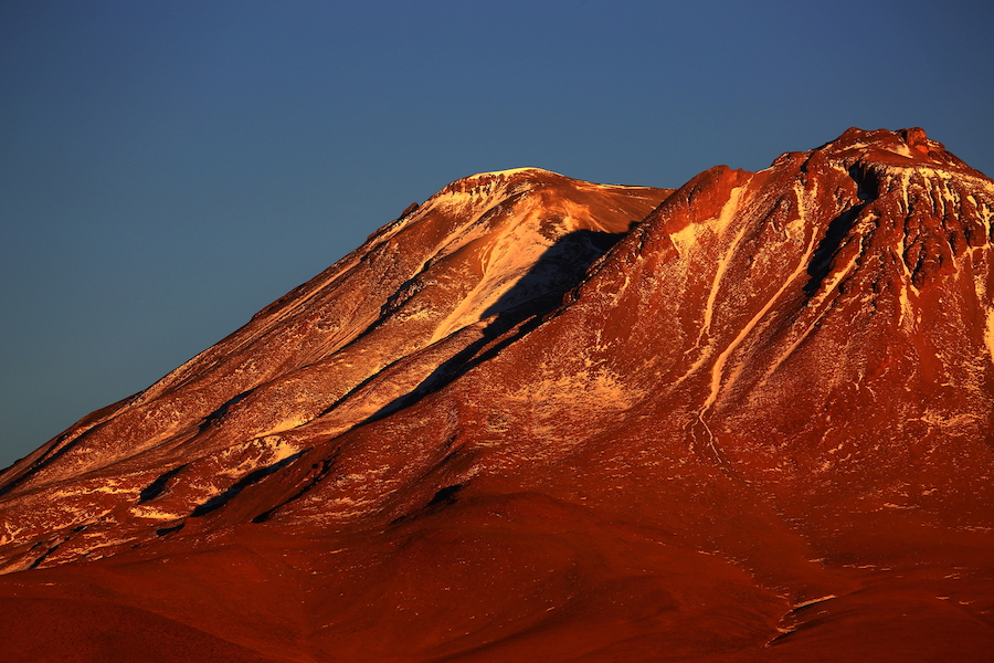 アリカは別の季節に再訪することにした。深夜バスに乗り込み、まずはアリカからカラマ[Calama]へ。カラマから乗り継いだバスは、朝陽の方角へアンデスの山嶺を登ってゆく。荒野の向こうに見えた集落が、ボリビアとの国境の街オジャグエ[Ollague]だった。