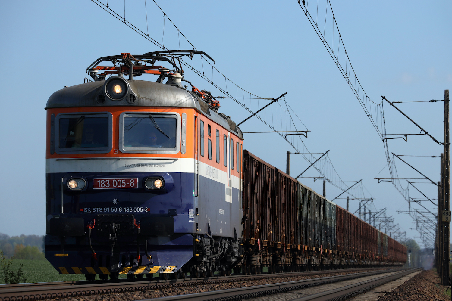 スロバキアの機関車がやってきた。山吹色と紺色の塗装が美しい。
