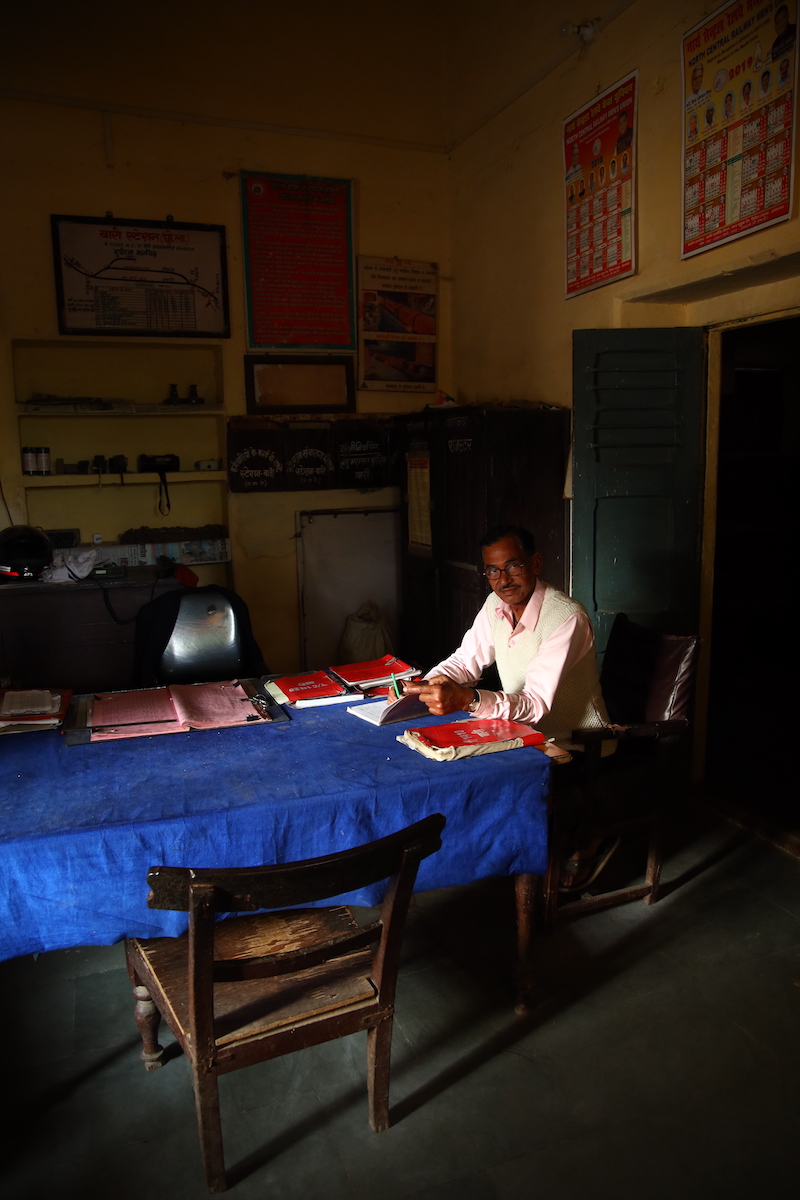 ここまでのハードスケジュールに草臥れて駅でうたた寝をしていると、心配した駅長さんが駅長室へと招いてくださった。記念に彼を撮影。青いテーブルクロスと赤い冊子、南国らしい原色の使い方が趣深い。