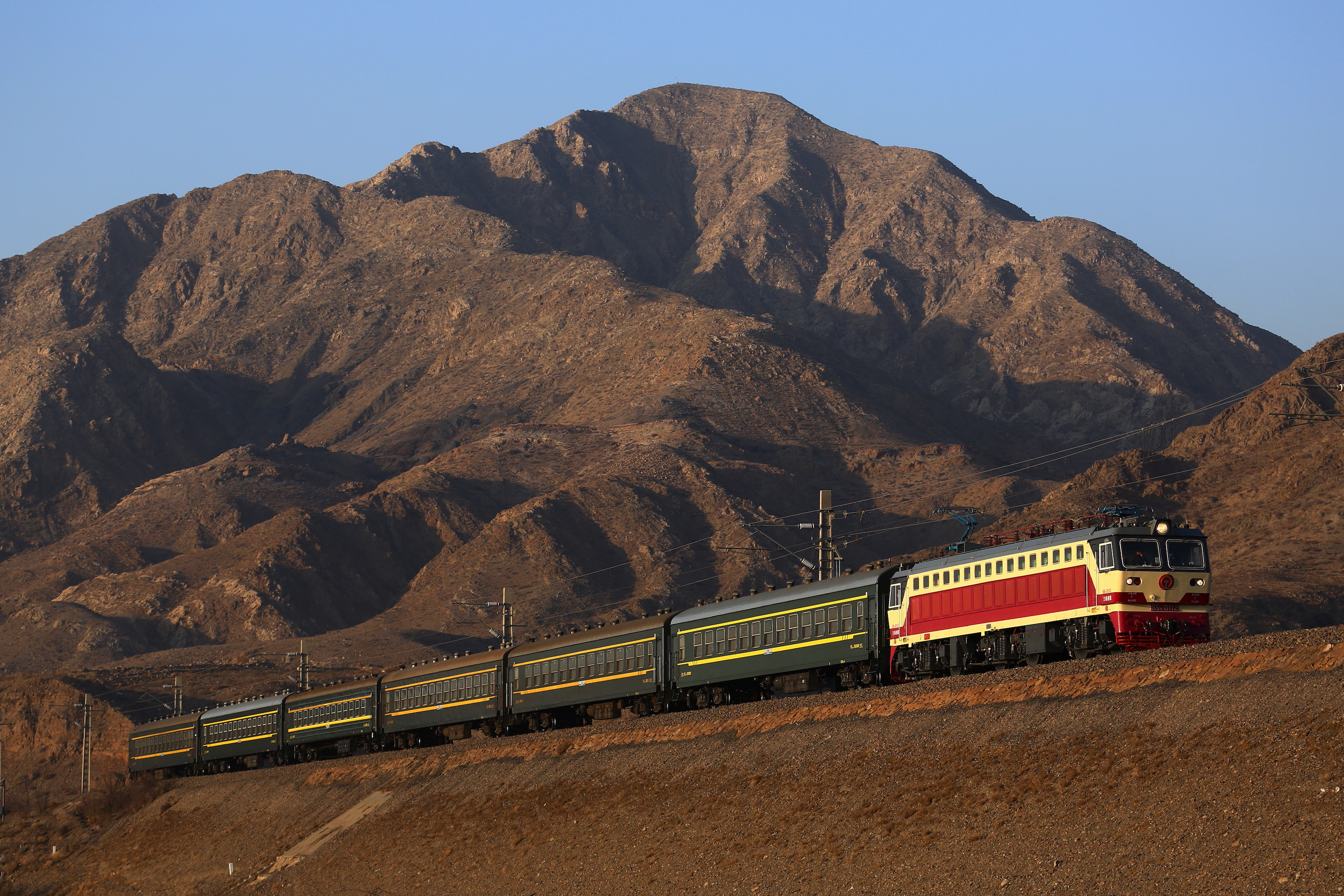 韶山7型 (中国の比較的古い国産電気機関車は「韶山」を名乗る) が、当時すでに珍しかった非空調の硬座車を連ねて、寧夏の赤茶けた大地を走る。