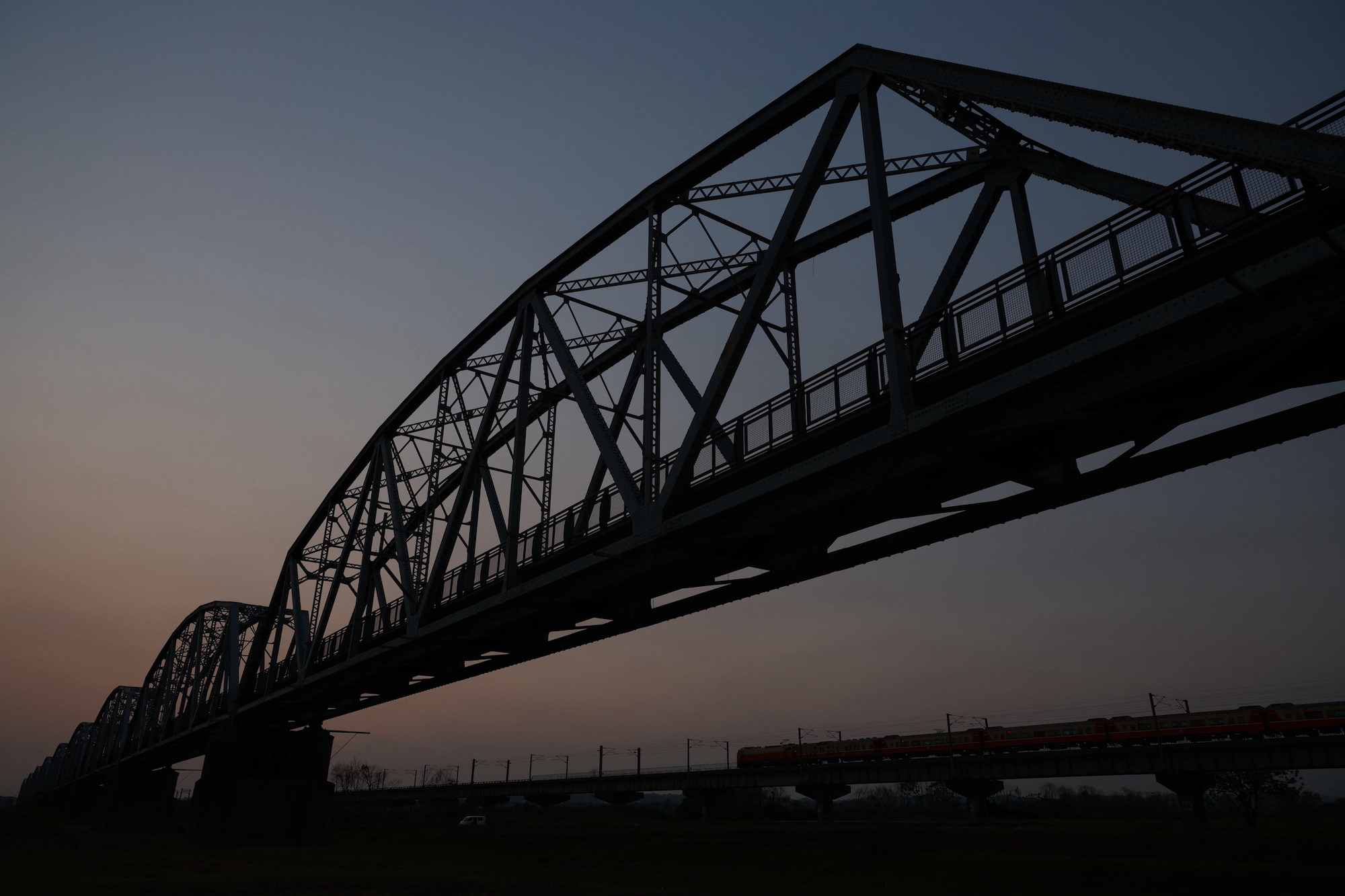 朝の光を浴びながら、アメロコ牽引の復興号客車が金崙渓を渡る。エアコンなどが露出していないツルッとした屋根が、日本の20系客車を思わせる。