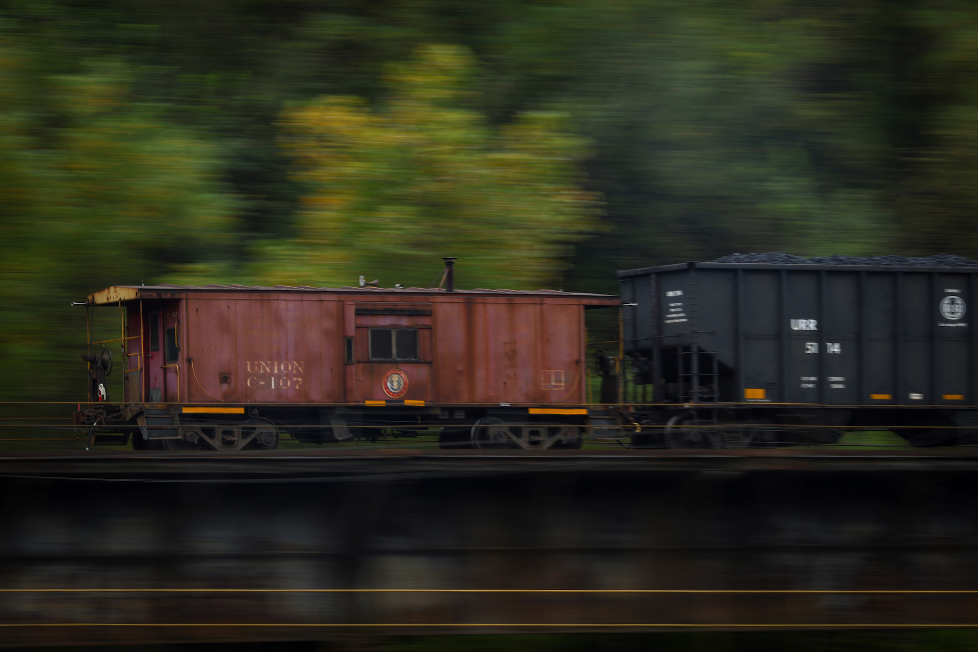 真っ黒の貨車のなかで、ベイ・ウィンドウ付きの鮮やかな車体がよく映える。