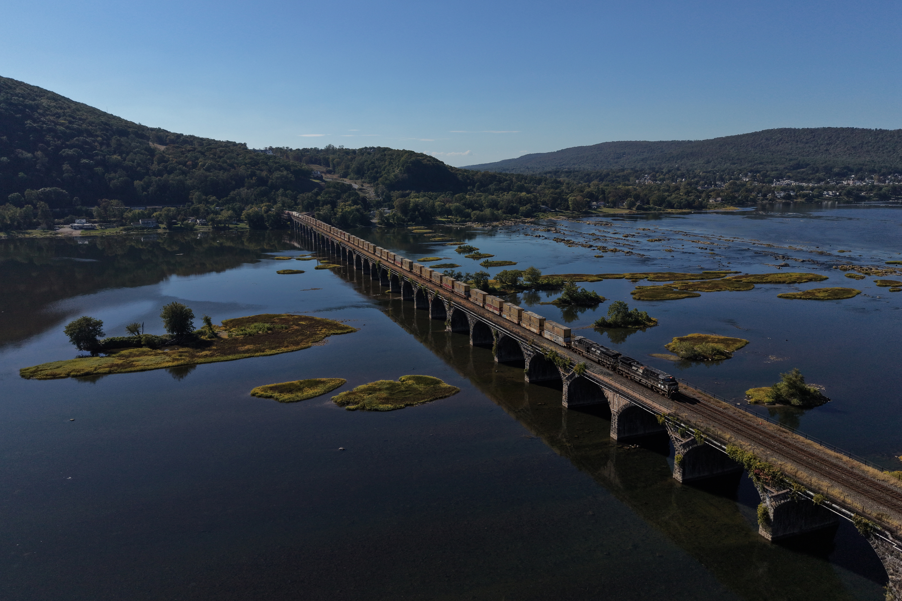 このRockville Bridgeなどは長さ1kmを超える超大橋だが、アメリカ名物のダブルスタック貨物列車はさも当然かのように、この橋から悠々とはみ出す長さでやってくる。
