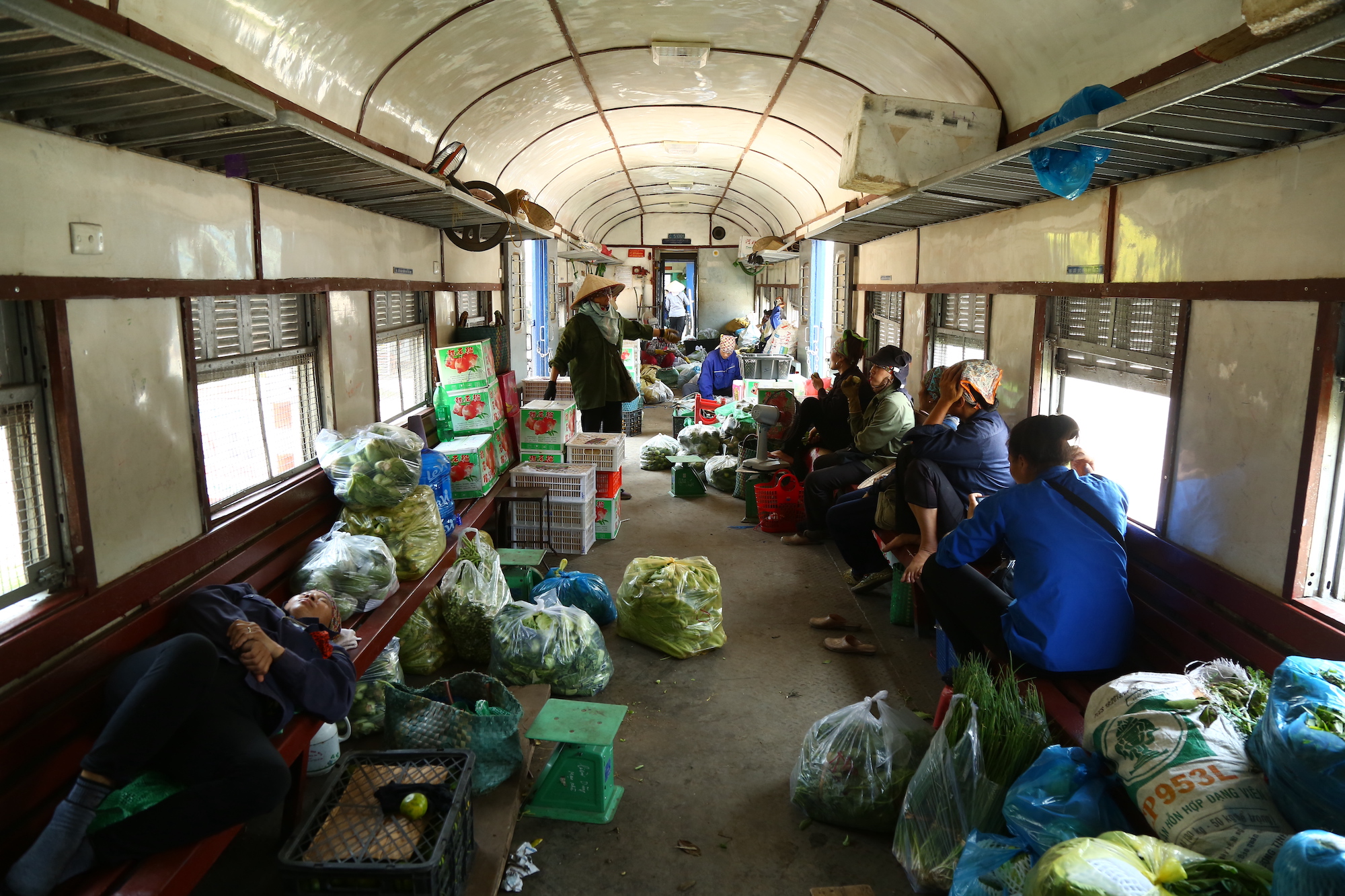 切妻客車のほうは車内がロングシートでひろびろとしており、行商人たちが思い思いに寛いだり、荷物の仕分けをしたりしていた。